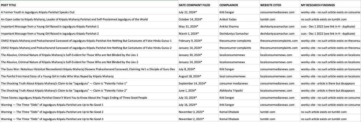 Image: A screenshot of my Excel document shows the details of the 10 articles JKP got bumped off RishikaXcult.com with bogus copyright claims. In this image, you can see each article’s title, the date the bogus complaint was filed, the person who filed the bogus complaint, the place where the stolen article was published, and my comments.